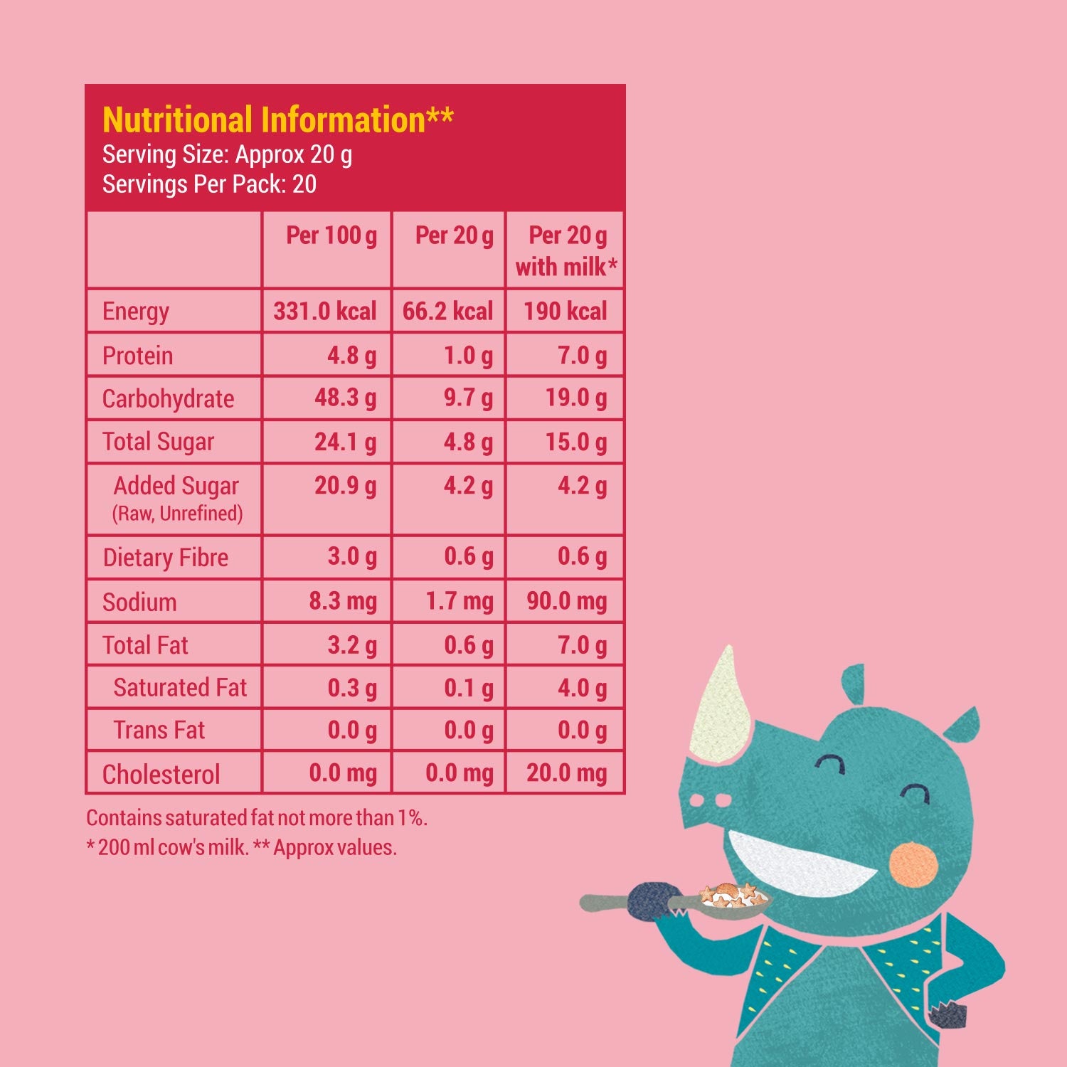 - 30g of this cereal with 200ml of cows milk provides 66% of daily Recommended Dietary Allowance (RDA) of calcium.