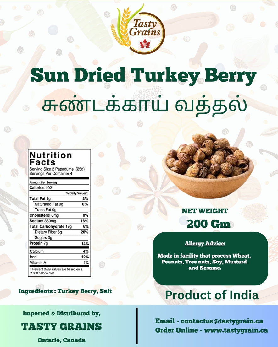 Bring home the rich, earthy flavors of traditional South Indian cooking with our Sun-Dried Turkey Berry, also known as Sundakkai Vathal. Carefully picked and sun-dried to perfection, these berries are packed with health benefits and a distinct, slightly bitter taste that enhances a variety of dishes.